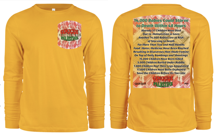 BACK Wordings: 14,000 Babies Could Starve to Death Within 48 Hours. Already 57 Children Have Died Due to Malnutrition in Gaza. Another 14,000 Babies are at Risk of Starving to Death. For More Than Two and Half Months Food, Water, Medicine Have Been Blocked Resulting in Disastrous Man-Man Famine. On Top of Daily Bombings and Shootings. 15,000 Children Have Been Killed. 5,000 Children Buried Under Rubble. 1,000 Children Had Their Legs Amputated. 17,000 Children Have Been Orphaned. Save the Children Before Its Too Late. Genocide Palestine