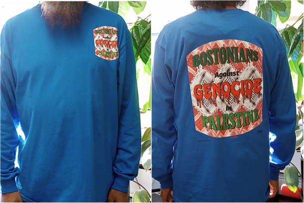 You can get T-Shirts imprinted with “Bostonians Against Genocide in Palestine” directly from us at Shahclan Boston – WasilahWords. The T-shirts are 100% cotton and long sleeve. Sizes available are Medium, Large and XL. Colors available are Blue, Dark Red and Black. The T-Shirts are unisex, so both men and women can wear these shirts fittingly.