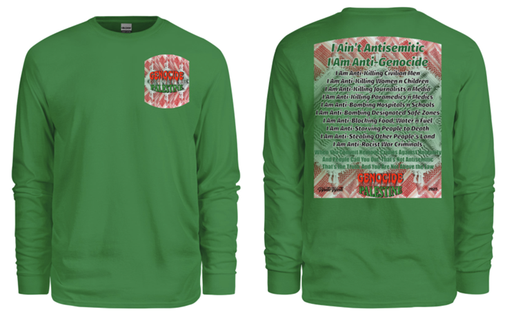 BACK Wordings: I Ain’t Antisemitic. I’m Anti-Genocide. I Am Anti-Killing Civilian Men. I Am Anti-Killing Women n Children. I Am Anti-Killing Journalists n Media. I Am Anti-Killing Paramedics n Medics. I Am Anti-Bombing Hospitals n Schools. I Am Anti-Bombing Designated Safe Zones. I Am Anti-Blocking Food, Water n Fuel. I Am Anti-Starving People to Death. I Am Anti-Stealing Other People’s Land. I am Anti-Racist War Criminals. When You Commit Heinous Crimes Against Humanity and People Call You Out, That’s Not Antisemitic, That’s the Truth. And You Are Not Above the Law. Genocide Palestine