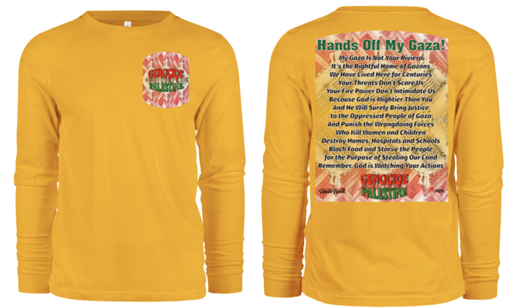 BACK Wordings: Hands Off My Gaza. My Gaza Is Not Your Riveira. It’s the Rightful Home of Gazans. We Have Lived Here for Centuries. Your Threats Don’t Scare Us. Your Fire Power Don’t Intimidate Us. Because God is Mightier Than You. And He Will Surely Bring Justice to the Oppressed People of Gaza. And Punish the Wrongdoing Forces Who Kill Women and Children. Destroy Homes, Hospitals and Schools. Block Food and Starve the People for the Purpose of Stealing Our Land. Remember God is Watching Your Actions. Genocide Palestine