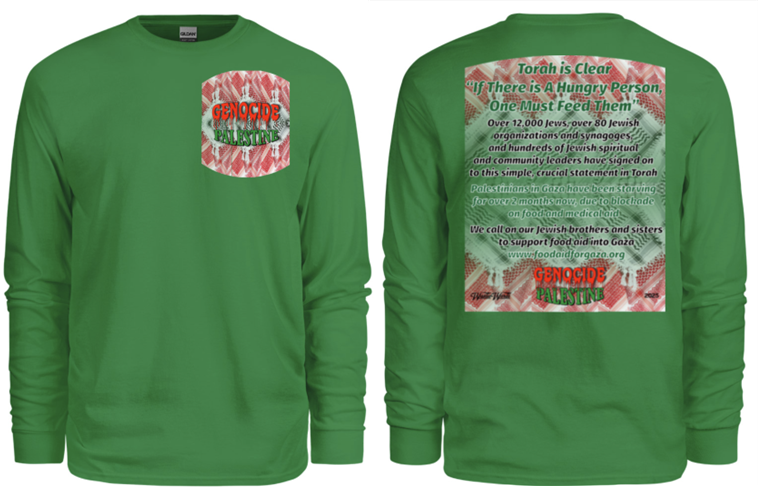 BACK Wordings: Torah is Clear – “If There is A Hungry Person, One Must Feed Them.” Over 12,000 Jews, over 80 Jewish organizations and synagogues, and hundreds of Jewish spiritual and communal leaders have already signed on to this simple, crucial statement. Palestinians in Gaza have been starving for over 2 months now, due to blockade on food and medical aid. We call on our Jewish brothers and sisters to support food aid into Gaza. www.foodaidforgaza.org. Genocide Palestine